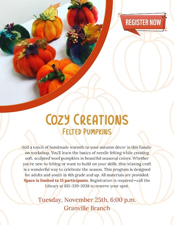 Add a touch of handmade warmth to your autumn décor in this hands-on workshop. You’ll learn the basics of needle felting while creating soft, sculpted wool pumpkins in beautiful seasonal colors. Whether you’re new to felting or want to build on your skills, this relaxing craft is a wonderful way to celebrate the season. This program is designed for adults and youth in 4th grade and up. All materials are provided. Space is limited to 15 participants. Registration is required—call the Library at 815-339-2038 to reserve your spot.