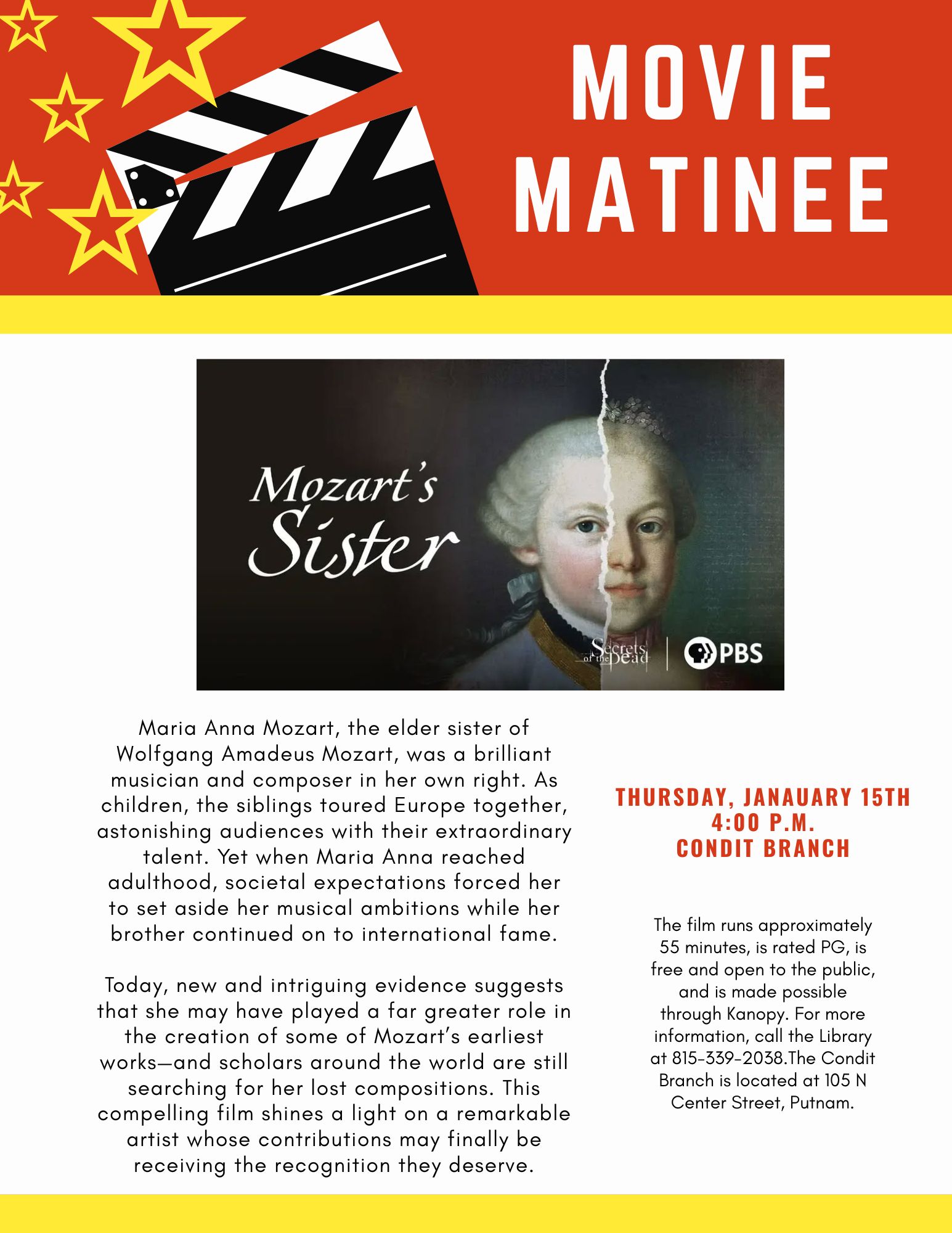 Today, new and intriguing evidence suggests that she may have played a far greater role in the creation of some of Mozart’s earliest works—and scholars around the world are still searching for her lost compositions. This compelling film shines a light on a remarkable artist whose contributions may finally be receiving the recognition they deserve. The film runs approximately 55 minutes, is rated PG, is free and open to the public, and is made possible through Kanopy.