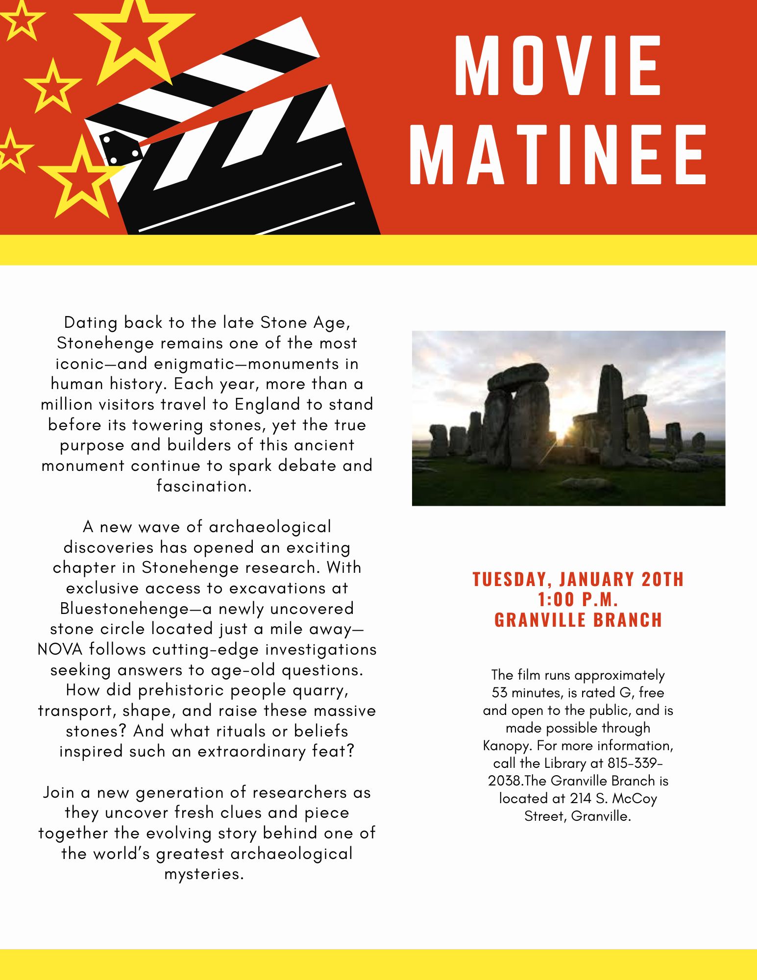 Join a new generation of researchers as they uncover fresh clues and piece together the evolving story behind one of the world’s greatest archaeological mysteries. The film runs approximately 53 minutes, is rated G, free and open to the public, and is made possible through Kanopy.