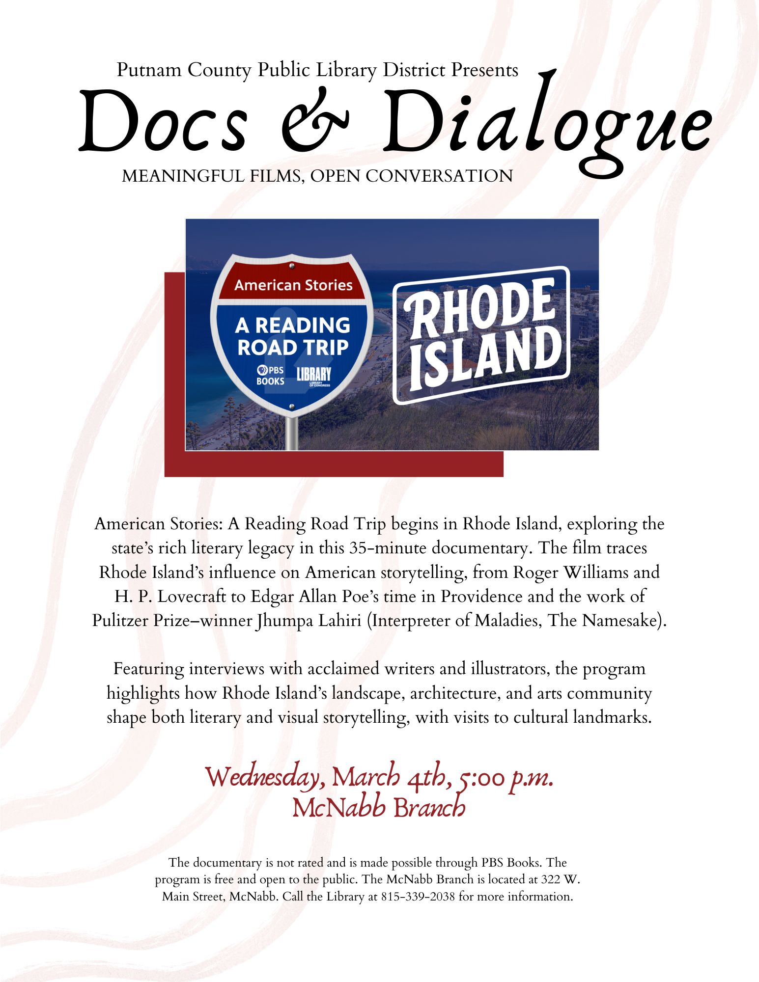 American Stories: A Reading Road Trip begins in Rhode Island, a state with a long and varied literary tradition. This 35-minute documentary examines Rhode Island’s literary legacy, from the revolutionary writings of Roger Williams and the Gothic fiction of H. P. Lovecraft to Edgar Allan Poe’s time in Providence and the work of Pulitzer Prize–winning author Jhumpa Lahiri, including Interpreter of Maladies and The Namesake. The program also includes interviews with writers and illustrators such as Anika Aldamuy Denise (Planting Stories), Christopher Denise (Knight Owl), Caldecott honoree Oge Mora (Thank You, Omu!), David Macaulay (The Way Things Work), and Elizabeth Rush (Rising). Their perspectives highlight how Rhode Island’s landscape, architecture, and arts community influence both literary and visual storytelling.