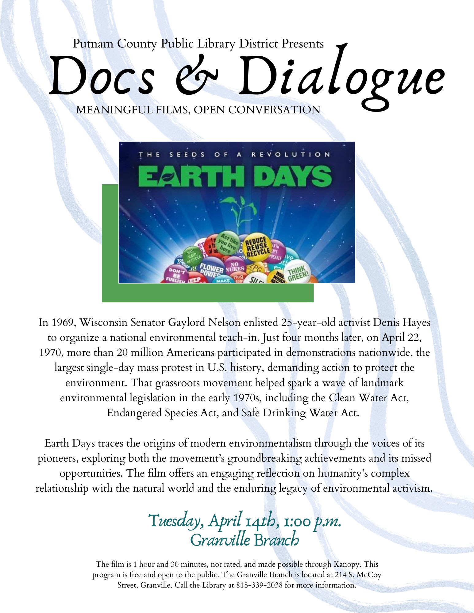 In 1969, Wisconsin Senator Gaylord Nelson enlisted 25-year-old activist Denis Hayes to organize a national environmental teach-in. Just four months later, on April 22, 1970, more than 20 million Americans participated in demonstrations nationwide, the largest single-day mass protest in U.S. history, demanding action to protect the environment. That grassroots movement helped spark a wave of landmark environmental legislation in the early 1970s, including the Clean Water Act, Endangered Species Act, and Safe Drinking Water Act. Earth Days traces the origins of modern environmentalism through the voices of its pioneers, exploring both the movement’s groundbreaking achievements and its missed opportunities. The film offers an engaging reflection on humanity’s complex relationship with the natural world and the enduring legacy of environmental activism. The film is 1 hour and 30 minutes, not rated, and made possible through Kanopy. This program is free and open to the public.
