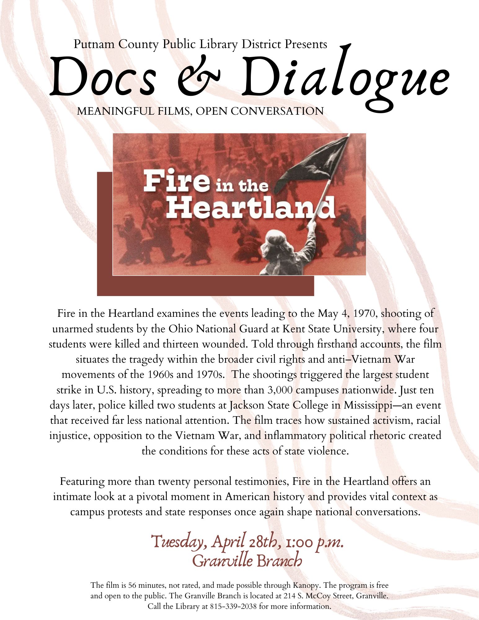 Docs & Dialogue: Fire in the Heartland: The Kent State Story Tuesday, April 28th, 1:00 p.m.