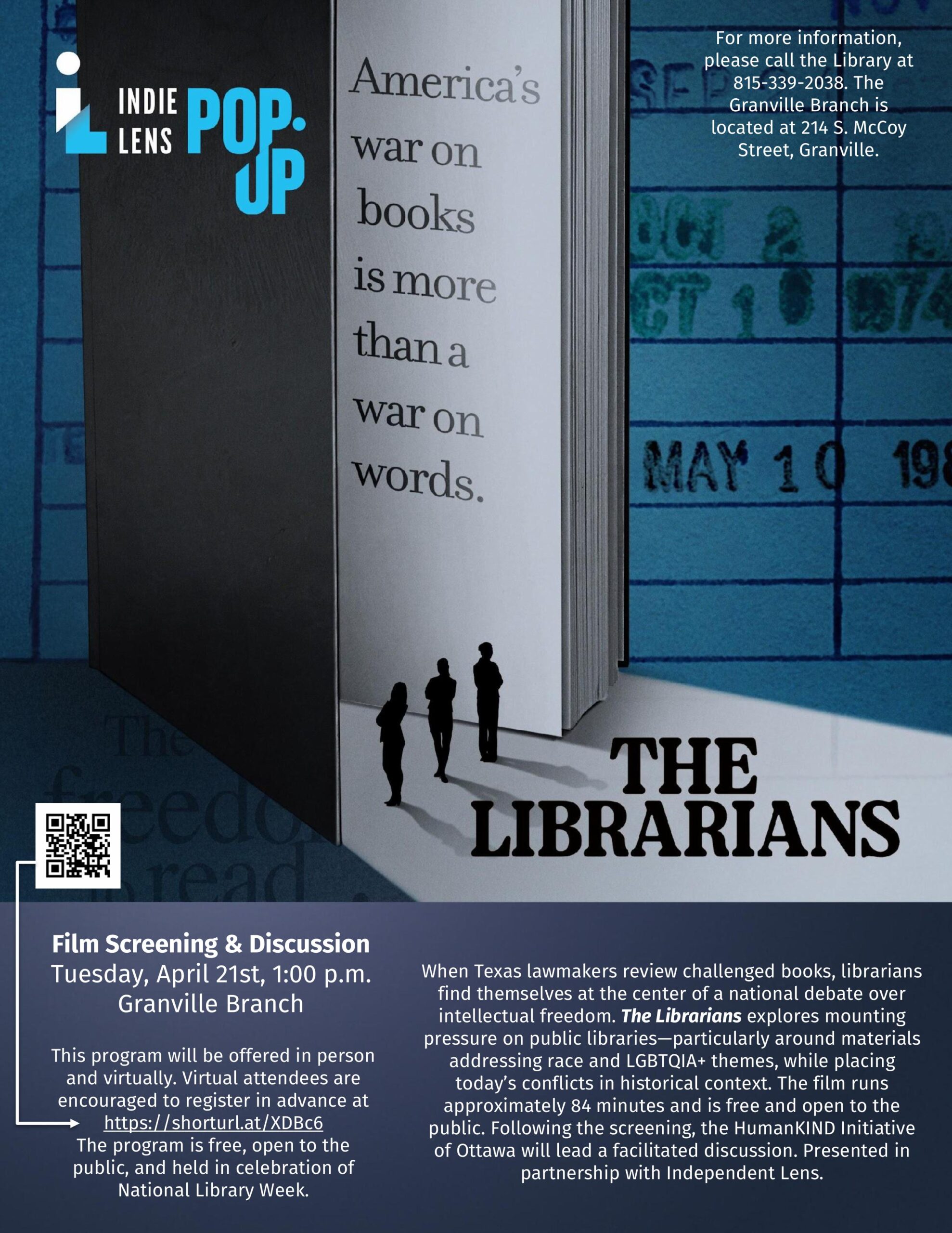 Presented through Independent Lens as part of the Indie Lens Pop-Up series, The Librarians explores the growing national debate over intellectual freedom and the role of public libraries in American democracy. When Texas lawmakers begin reviewing lists of challenged books, librarians find themselves on the front lines of an intensifying cultural conflict. The film examines mounting pressure on libraries, particularly around materials addressing race and LGBTQIA+ themes, while placing today’s controversies in historical context. The 84-minute screening will be followed by a facilitated discussion with representatives from the Humankind Initiative in Ottawa. The discussion, expected to last approximately 30 minutes, will offer attendees an opportunity to reflect on the film’s themes and engage in thoughtful dialogue about education, public institutions, and the freedom to read.