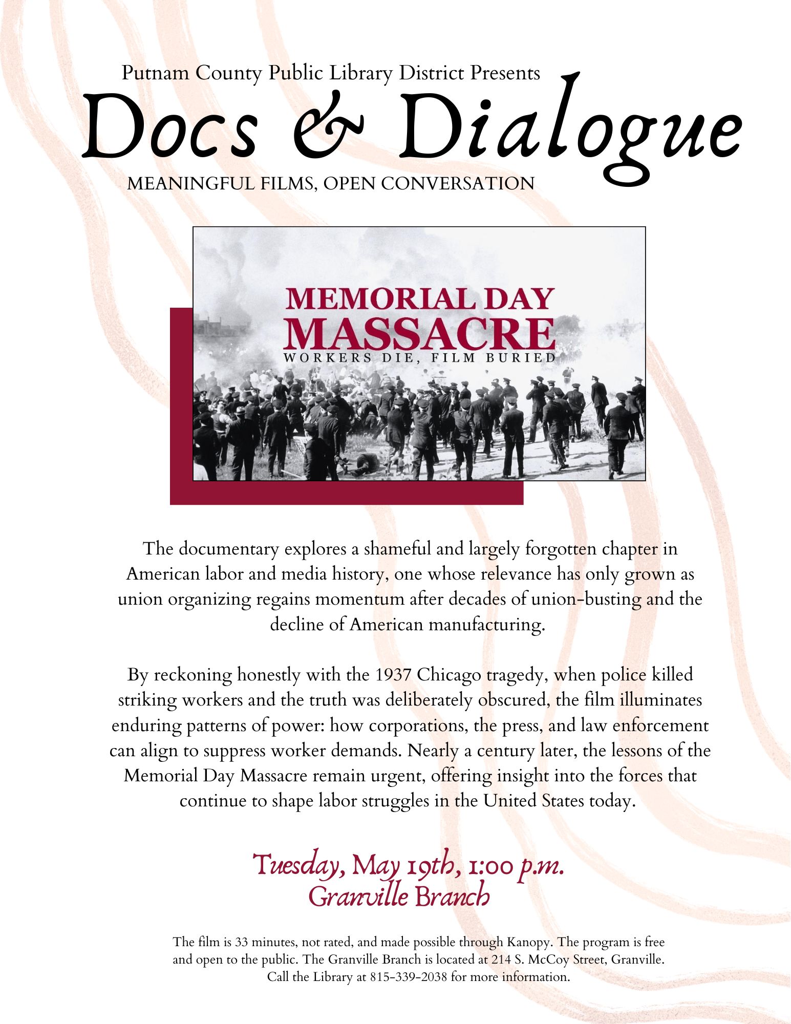 Docs & Dialogue: Memorial Day Massacre: Workers Die, Film Buried (Granville Branch) Tuesday, May 19th, 1:00 p.m.