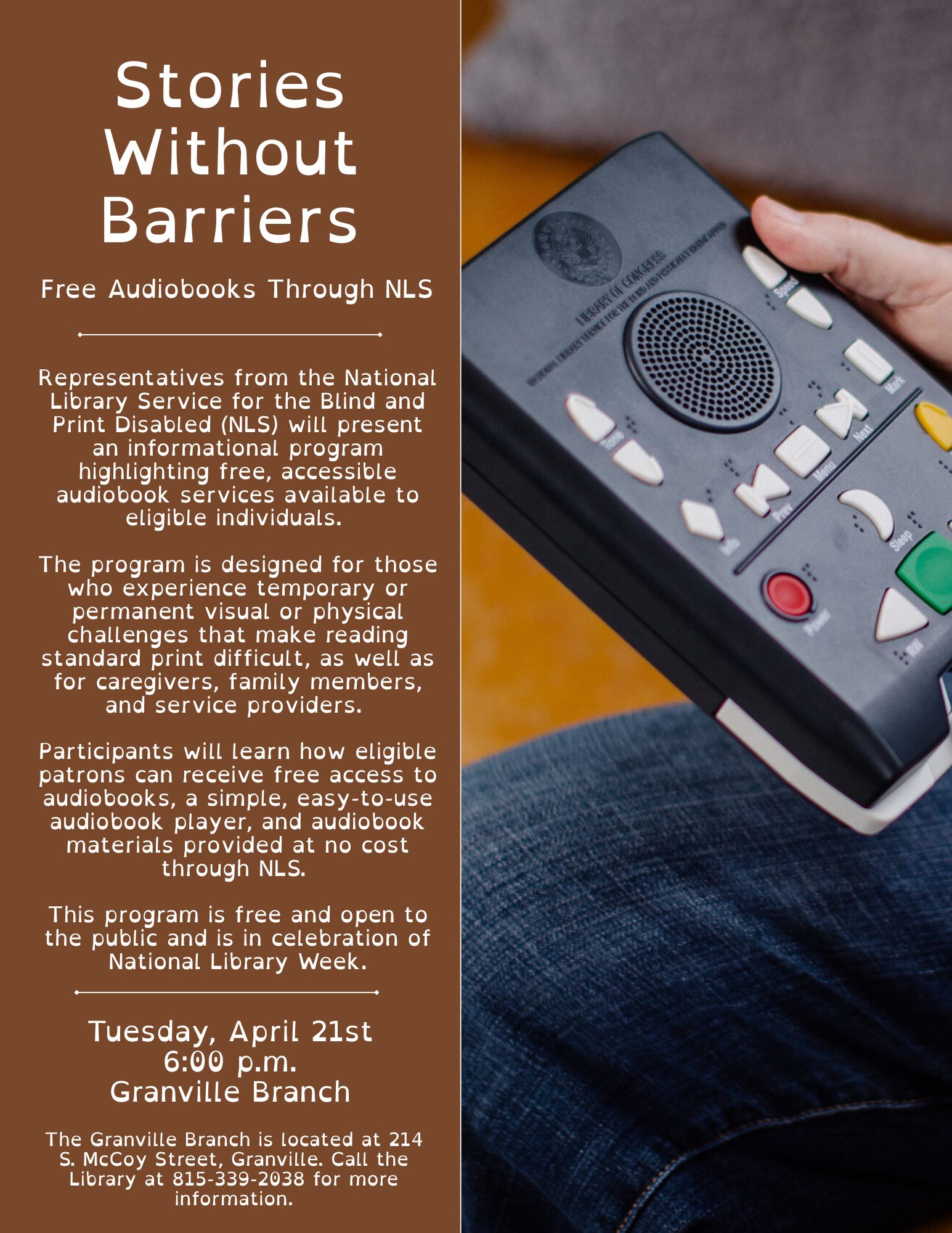 Representatives from the National Library Service for the Blind and Print Disabled (NLS) will present an informational program highlighting free, accessible audiobook services available to eligible individuals. The program is designed for those who experience temporary or permanent visual or physical challenges that make reading standard print difficult, as well as for caregivers, family members, and service providers. Participants will learn how eligible patrons can receive free access to audiobooks, a simple, easy-to-use audiobook player, and audiobook materials provided at no cost through NLS.